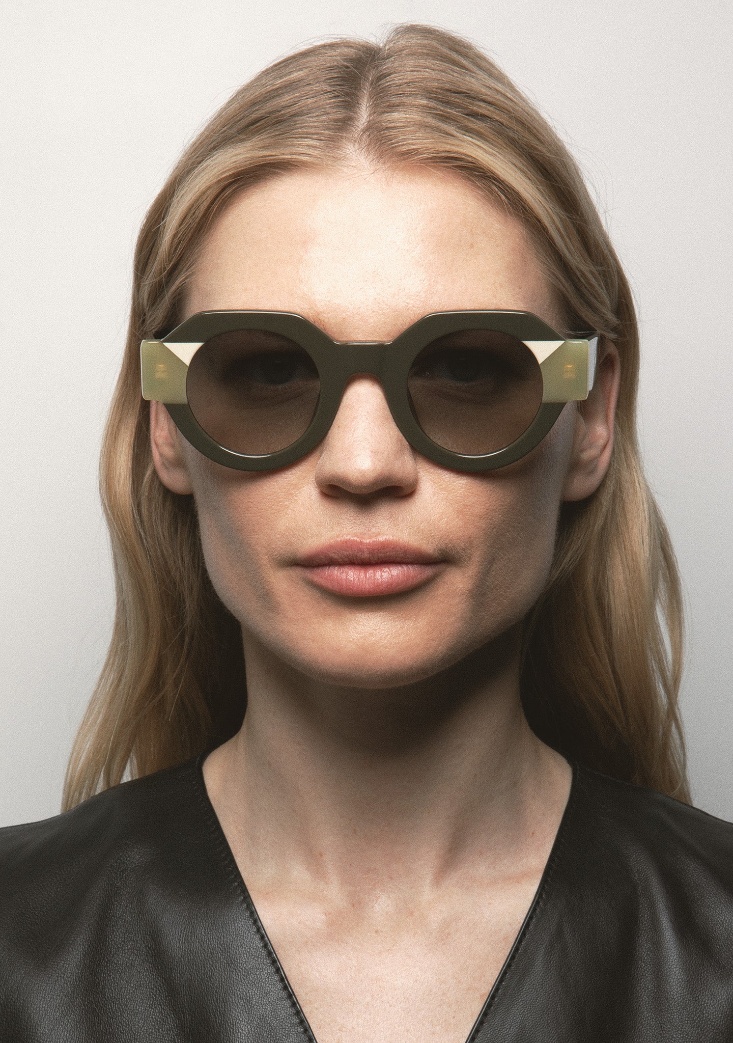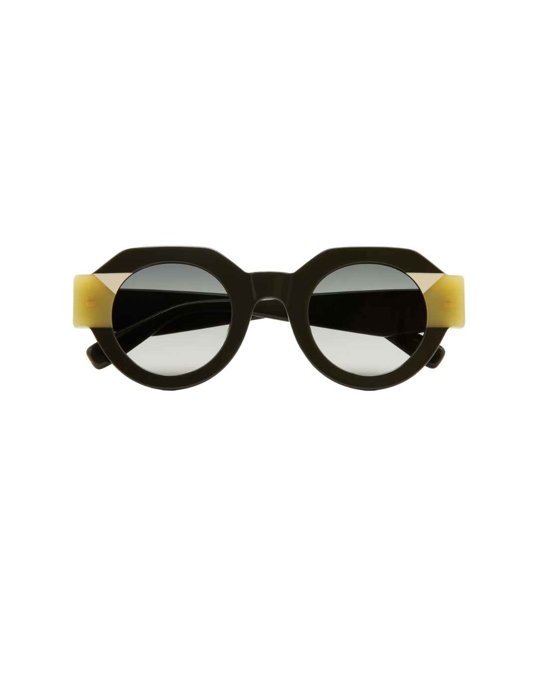 Gafas de sol redondas con la parte superior ligeramente más recta. Montura frontal de acetato verde oliva con doble laminado en verde claro translúcido y blanco. Patillas de acetato verde oliva. Lentes verdes degradadas de base 2. Lentes de categoría 2. Plaquetas nasales de acetato integradas. Hechas a mano.