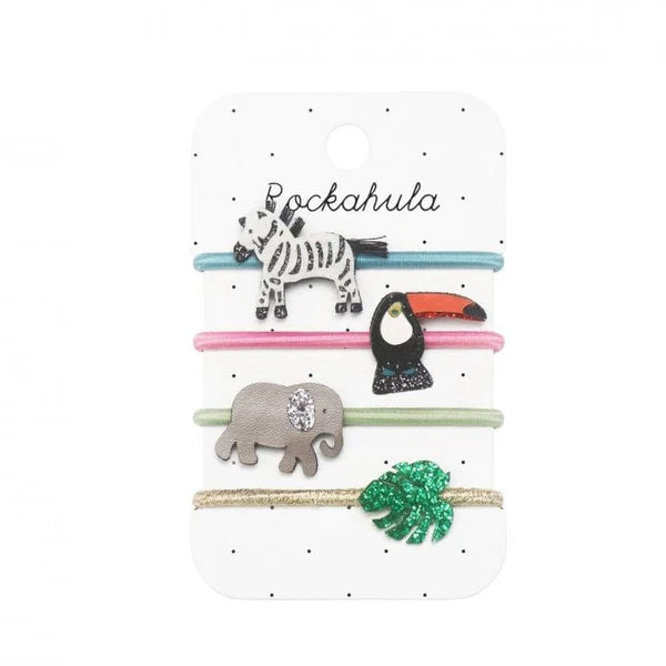 Pack de cuatro ponis variados: una cebra brillante, un tucán Tina, un elefante y una hoja verde brillante.